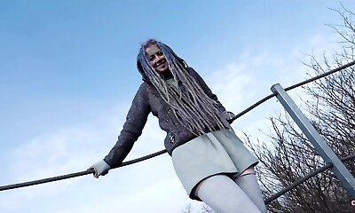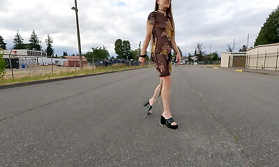Longpussy, out for a walk, Huge Snatch Plug, Sheer Top, High Heels, Thigh Highs and a Brief Skirt in Public!