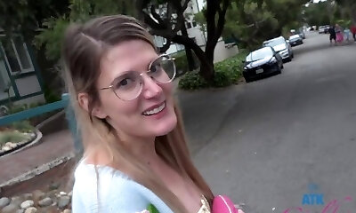 Kinky straight haired blonde gal in nerdy glasses gets fucked rear end